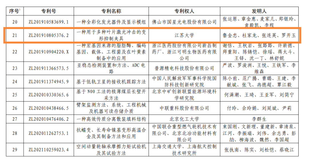近日,国家知识产权局发布第二十四届中国专利奖授奖决定,乐鱼官方体育网站专利“一种用于多种叶片激光冲击的变形抑制夹具”(专利号ZL201910805376.2)喜获中国专利金奖。此次共有83所高校获得中国专利奖,获金奖的高校仅有5所,其中西安交通大学有2个项目获得金奖,浙leyu乐鱼(中国)学、上海交通大学、北京化工大学和乐鱼官方体育网站各有1项金奖。