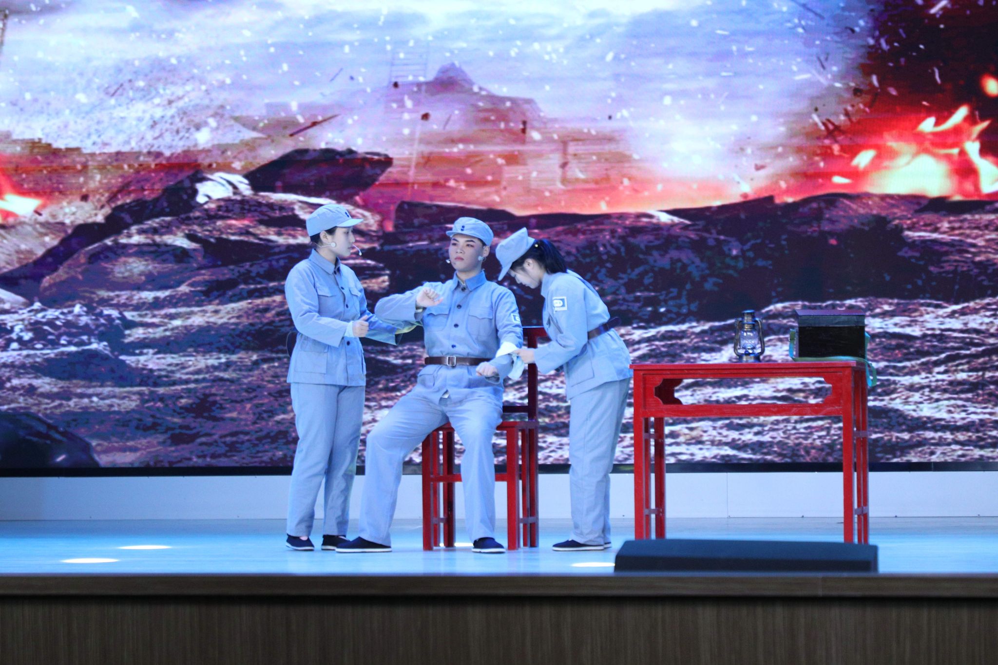 王龙烈士家属、王龙民兵排代表、马克思主义学院师生代表观看了思政舞台剧《王龙亭》排演现场,在沉浸式的情境中触摸历史脉搏,感悟初心使命,传承红色基因。