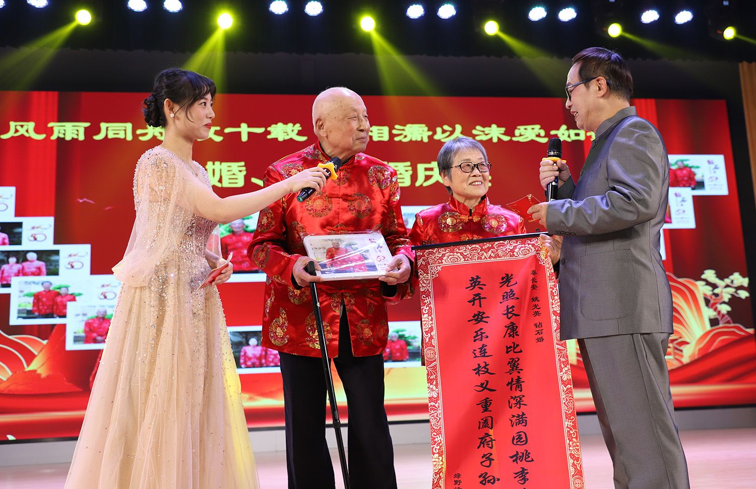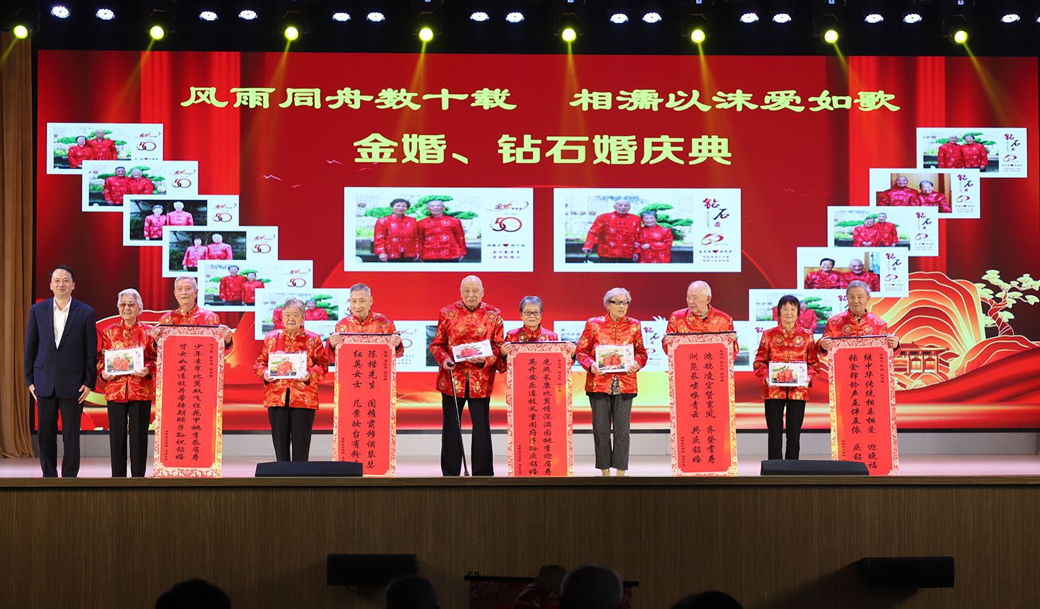 学校今年共有钻石婚夫妇14对、金婚夫妇9对。联欢会上,任旭东向钻石婚和金婚夫妇代表赠送了嵌名楹联和水晶纪念照。