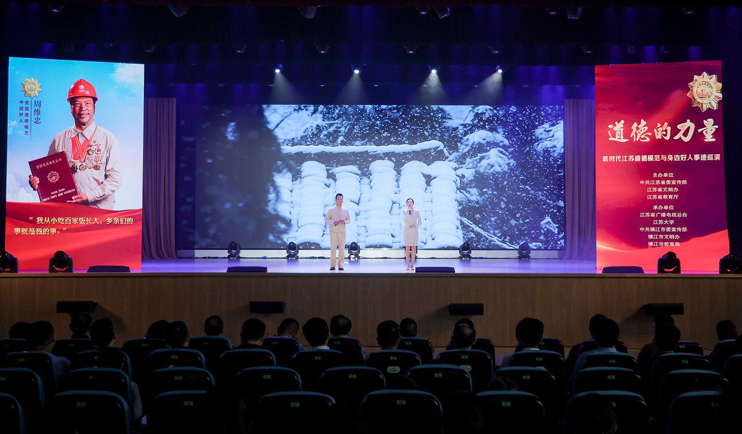 10月25日,由中共江苏省委宣传部、江苏省文明办、江苏省教育厅主办,江苏省广播电视总台、乐鱼官方体育网站、中共镇江市委宣传部、镇江市文明办、镇江市教育局承办的“道德的力量”——新时代江苏道德模范与身边好人事迹高校巡演走进我校。