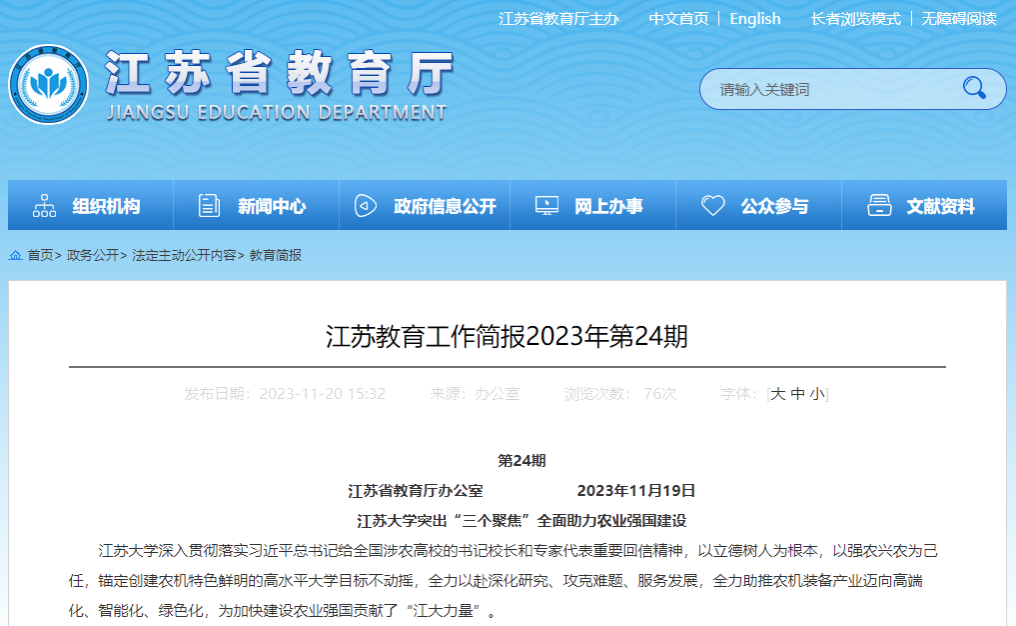 11月20日,江苏省教育厅《江苏教育工作简报》(2023年第24期)以《乐鱼官方体育网站突出“三个聚焦”全面助力农业强国建设》为题,从“聚焦深化科技创新,加快打造农机研究新高地”“聚焦破解行业难题,不断实现农机技术新突破”“聚焦服务乡村振兴,全面提升农机装备新贡献”三个方面,专题报道了我校科技强农兴农工作。
