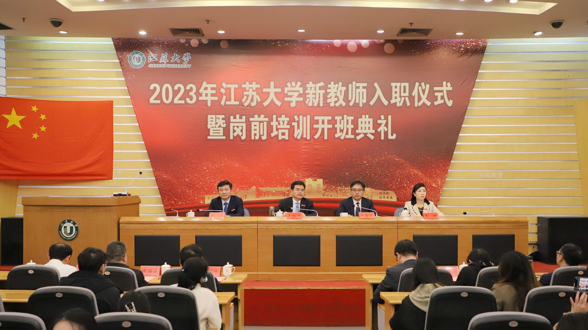 入职仪式上,全体新教师签订了《师德师风承诺书》,新教师代表递交承诺书,主席台领导为新教师代表佩戴校徽。新教师入职宣誓环节,党委教师工作部部长、人事处处长王飞领誓,全体新教师面向国旗郑重宣誓,铮铮誓言彰显从教初心。