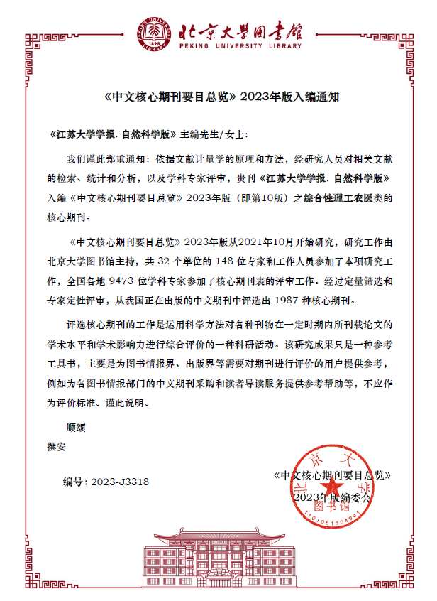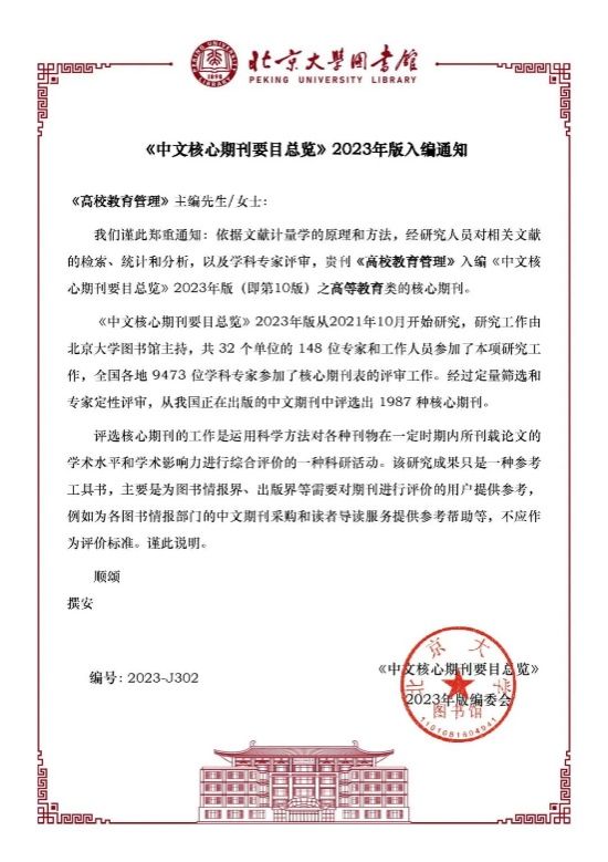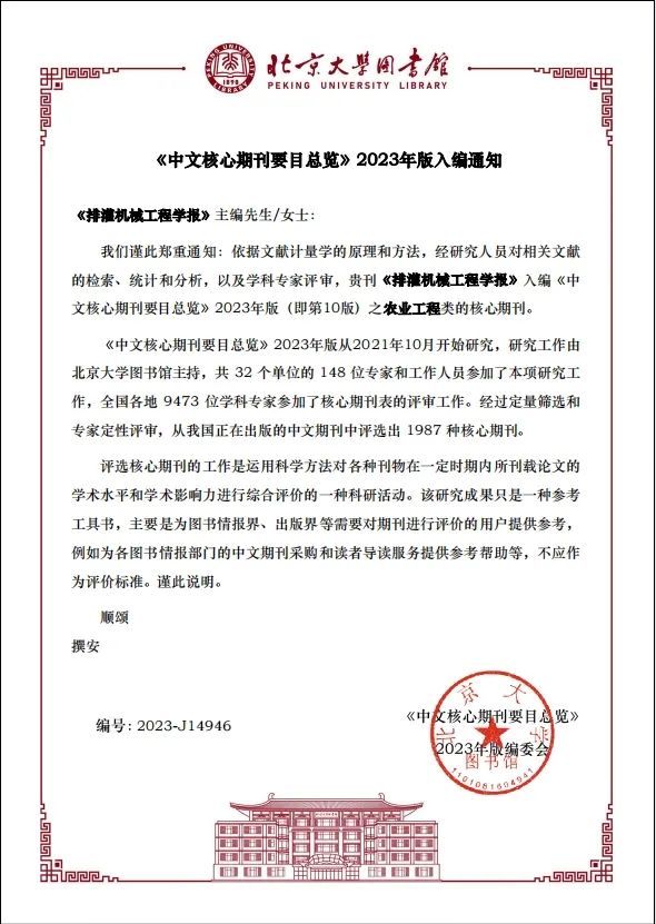 近日,在北京大学图书馆《中文核心期刊要目总览》2023年版(第10版)遴选中,我校主办的《乐鱼官方体育网站学报(自然科学版)》第8次入选,入编综合性理工农医类核心期刊;《排灌机械工程学报》第7次入选,入编农业工程类核心期刊;《高校教育管理》第4次入选,入编高等教育类核心期刊。