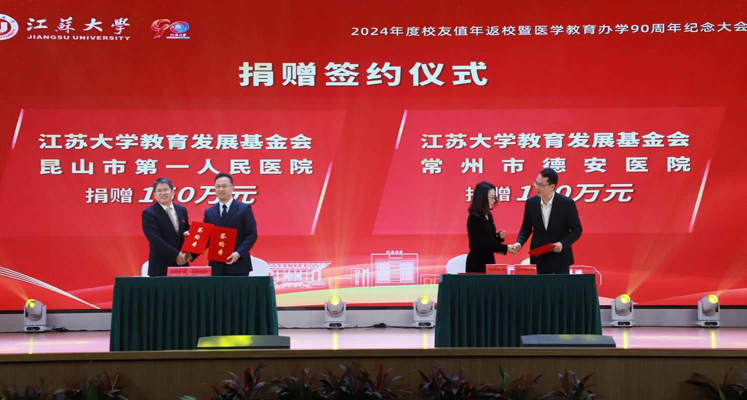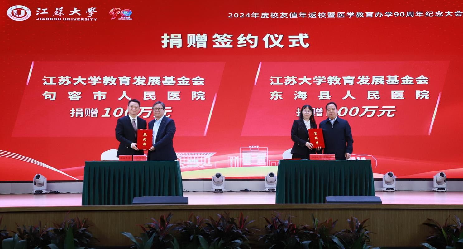 纪念大会上举行了捐赠签约仪式。昆山市第一人民医院捐赠150万元,设立乐鱼官方体育网站附属昆山医院医学基金;常州市德安医院捐赠150万元,设立乐鱼官方体育网站医学发展基金—常州德安基金;句容市人民医院捐赠100万元,设立乐鱼官方体育网站附属句容医院医学基金;东海县人民医院捐赠100万元设立东海人民医院医学基金。昆山市第一人民医院院长李翀、常州市德安医院院长黄孝峰与邹小波、蔡英凤共同签约。句容市人民医院党委书记笪爱华、东海县人民医院副院长许夫杰与乐鱼官方体育网站医学院党委书记邱健、院长钱晖共同签约。