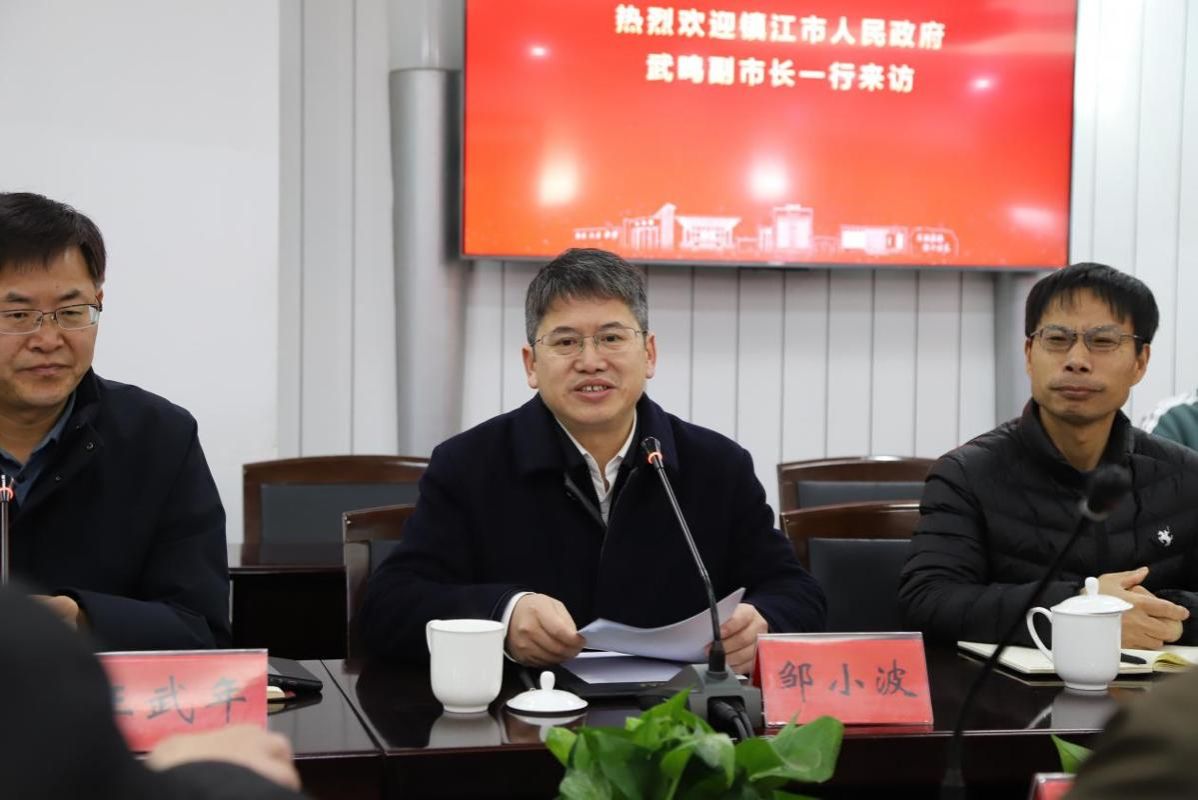 邹小波介绍了我校校情、近几年校地合作成效、学校体育事业发展情况。武鸣介绍了体育强国建设、足球振兴发展的相关政策和江苏省城市足球联赛基本情况。双方就共同组建镇江市城市足球队参加足球联赛、校地进一步深化合作进行了深入交流。