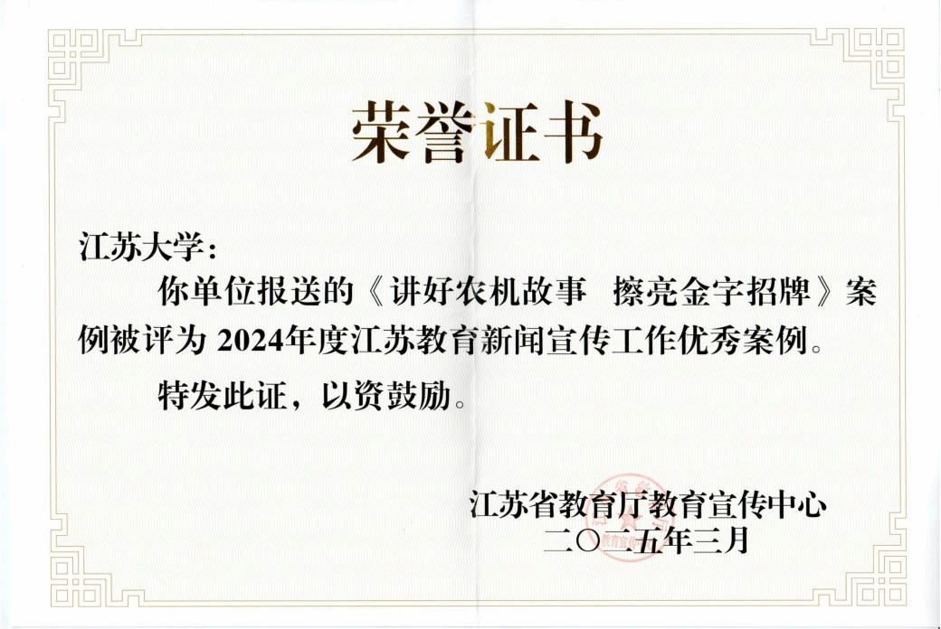 近日,江苏省教育厅教育宣传中心公布了2024年度江苏教育新闻宣传工作优秀案例评选结果,我校报送的《讲好农机故事 擦亮金字招牌》工作案例获评优秀案例。
