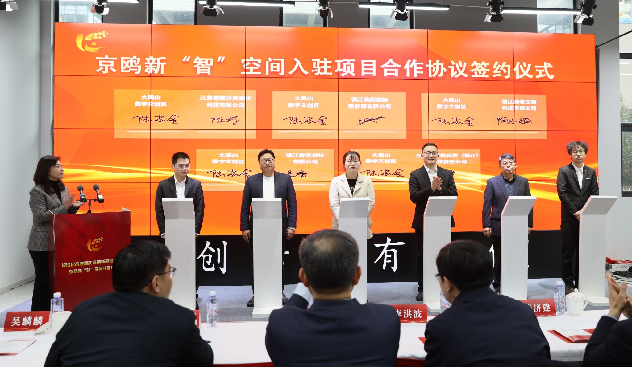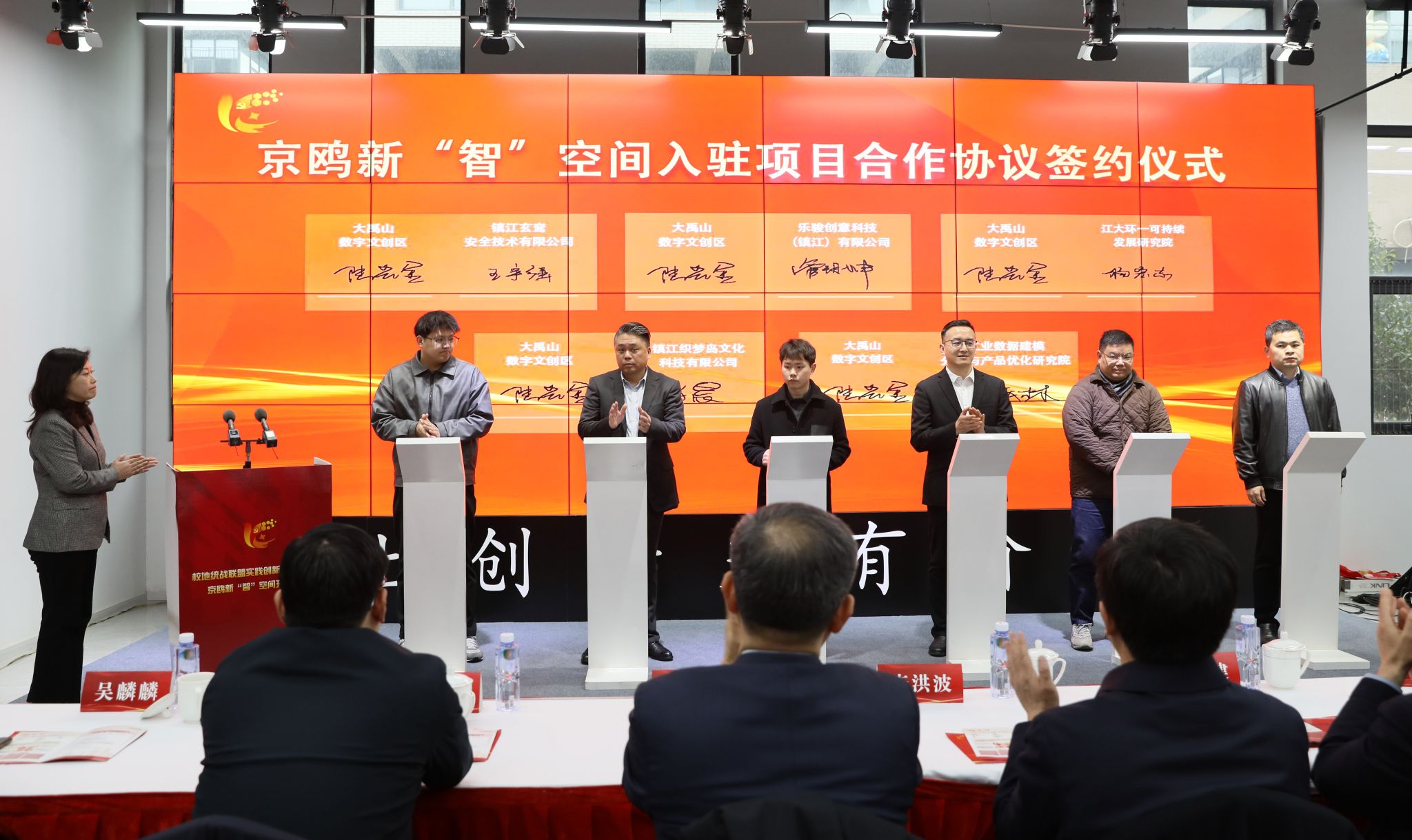 教务处、艺术学院、计算机学院、汽车工程研究院与大禹山数字文创区签订校地创新合作协议,学校10名统战成员负责的项目签约入驻京鸥新“智”空间。