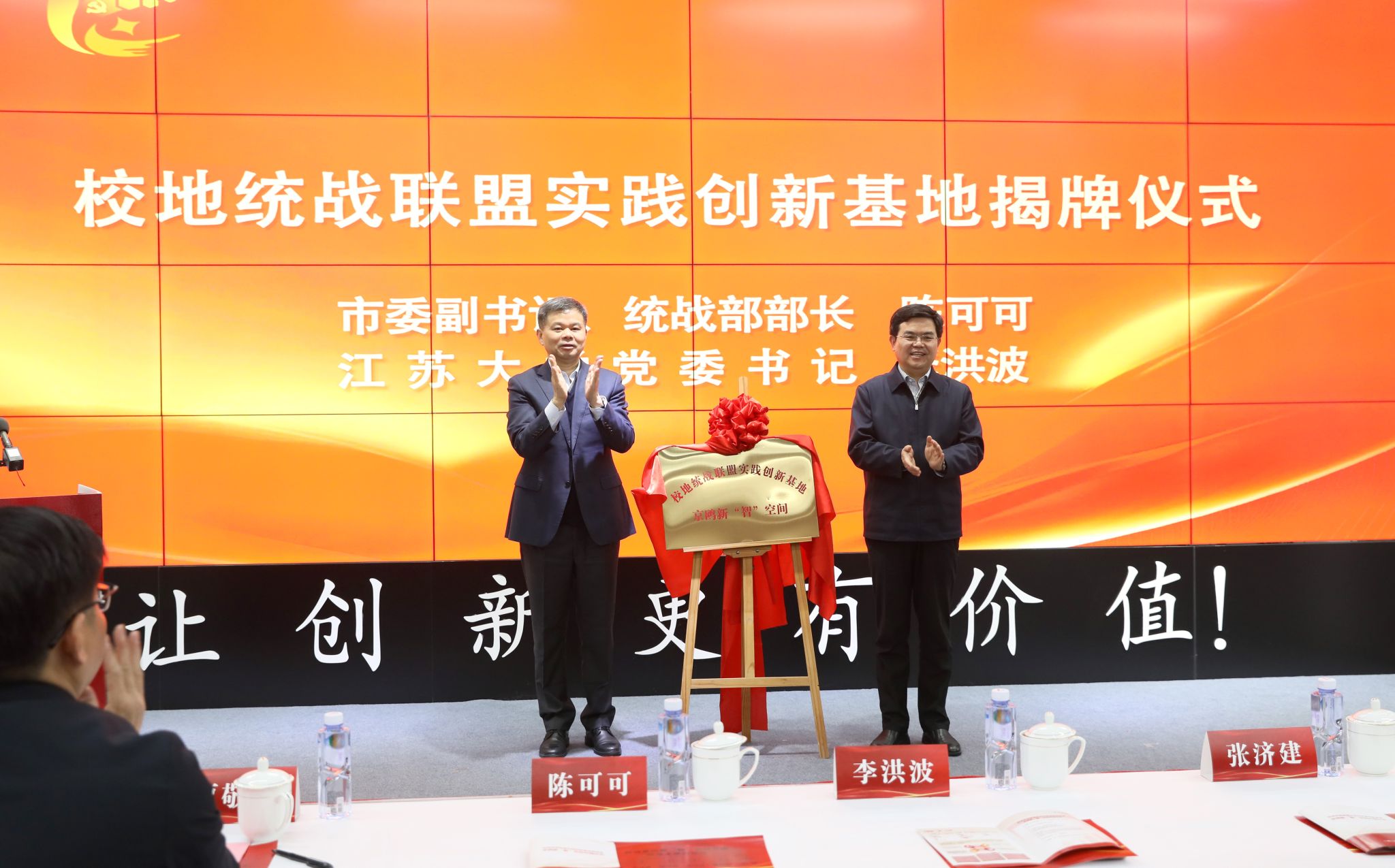 活动中,陈可可、李洪波为校地统战联盟实践创新基地揭牌,贾敬远致辞。