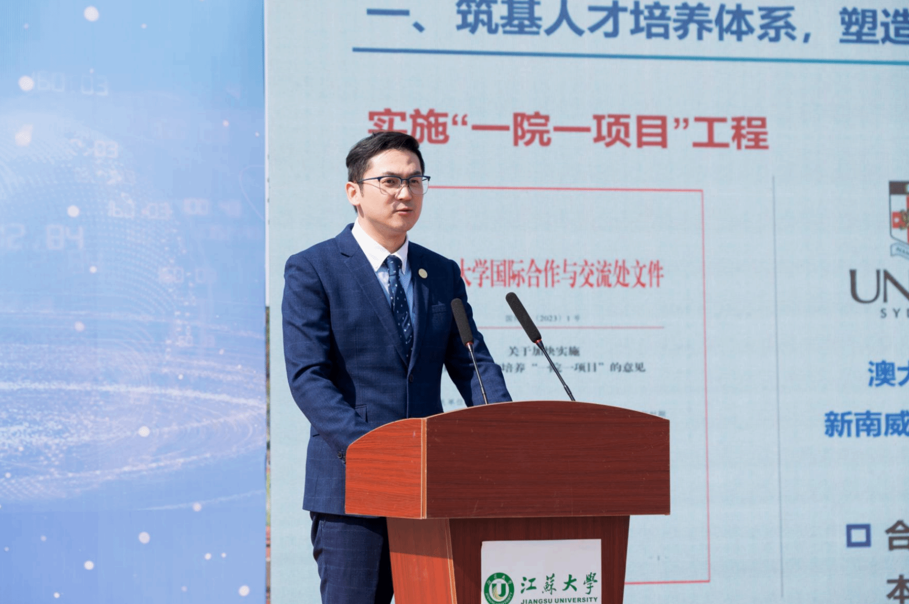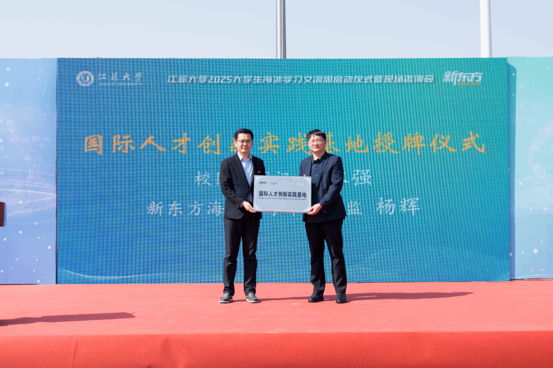 校团委书记张永强代表学校向新东方海外留学部杨辉授牌建立国际人才创新实践基地。