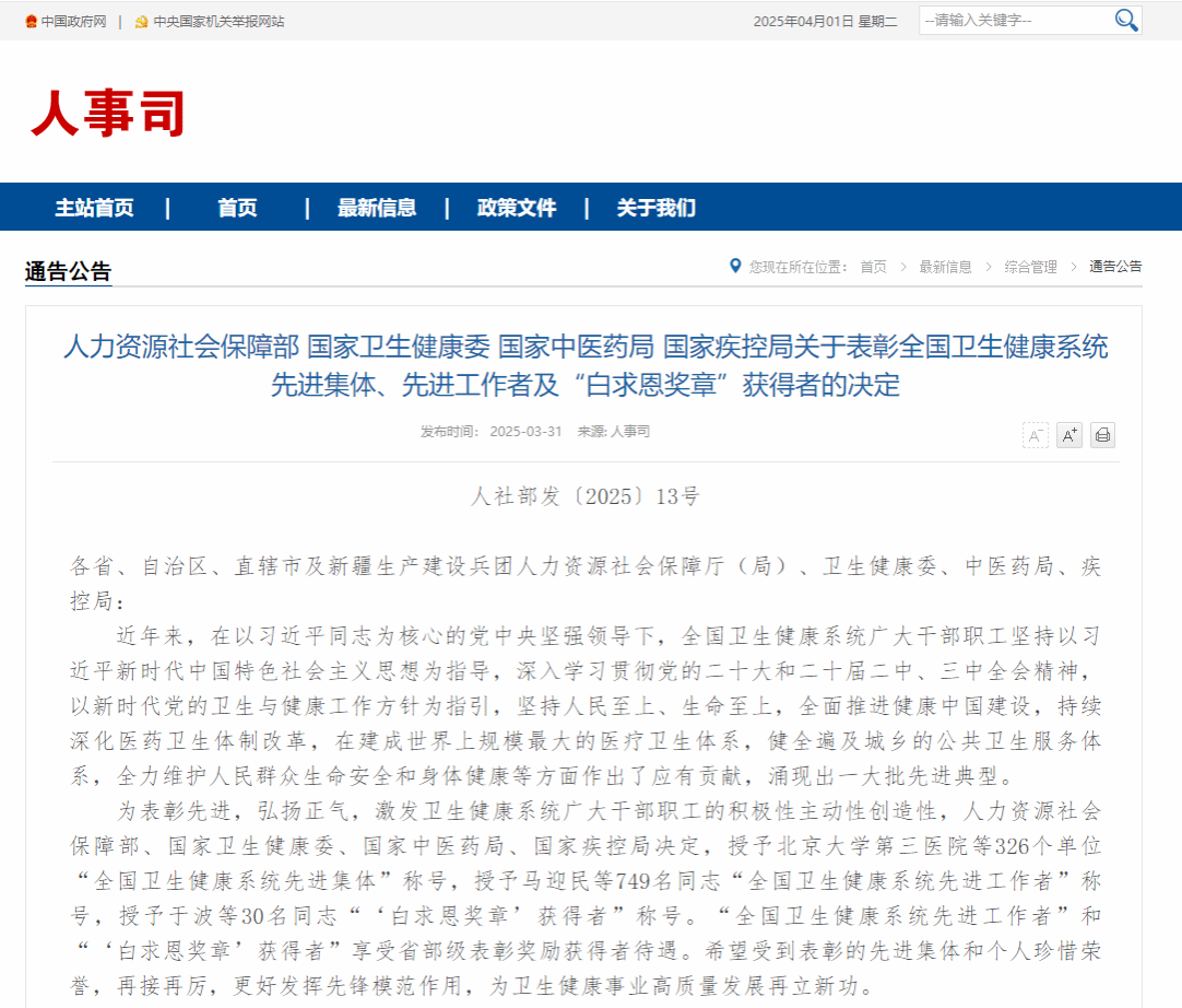 近日,人力资源社会保障部、国家卫生健康委、国家中医药局、国家疾控局发布了《关于表彰全国卫生健康系统先进集体、先进工作者及“白求恩奖章”获得者的决定》,附属医院中医内科主任、主任中医师钱华获得“全国卫生健康系统先进工作者”荣誉称号。