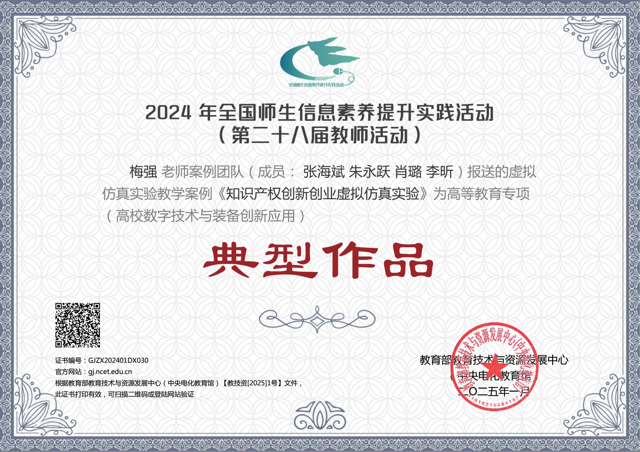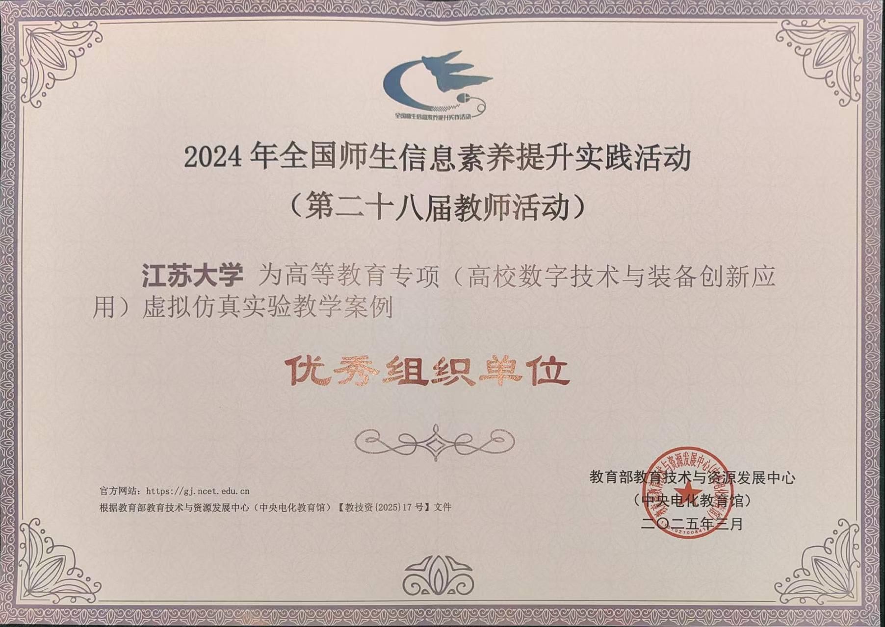 近日,在教育部教育技术与资源发展中心(中央电化教育馆)开展的2024年全国师生信息素养提升实践活动(第二十八届教师活动)中,“高等学校虚拟仿真教学创新实验室”项目2024年度案例征集评选结果正式揭晓。全国共有116项虚拟仿真实验教学案例获评高等教育专项典型作品,其中江苏省23项。我校4个项目入选,学校获评“优秀组织单位”。
