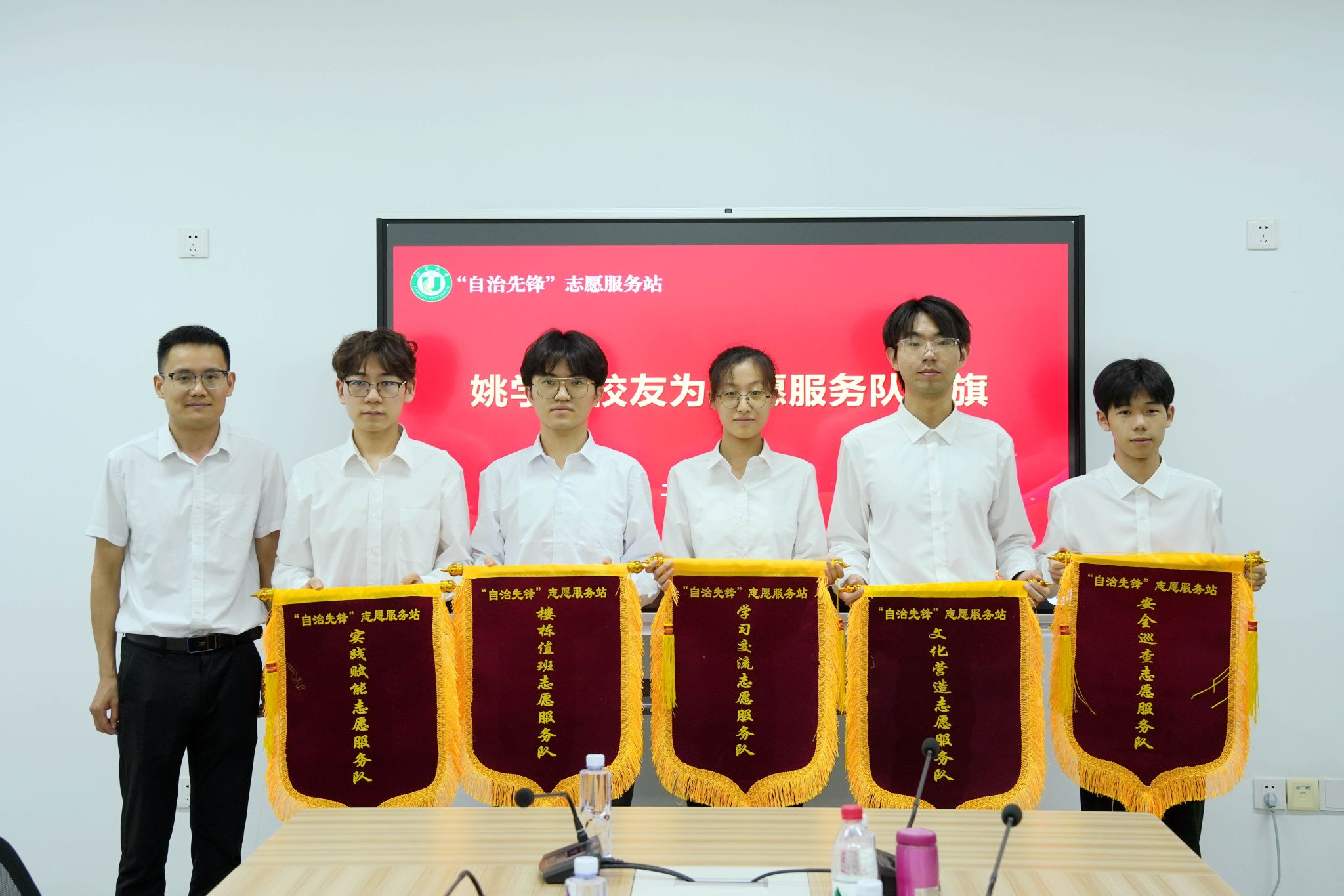 “自治先锋”志愿服务站是践行楼栋自治的重要载体,通过“学生自我管理+劳模精神”引领模式,打造五支专项志愿服务队,为同学们提供便捷、高效的服务。姚学良为五支志愿服务队授旗,并鼓励志愿者们要发扬奉献、友爱、互助、进步的志愿精神,积极投身于志愿服务活动中去。