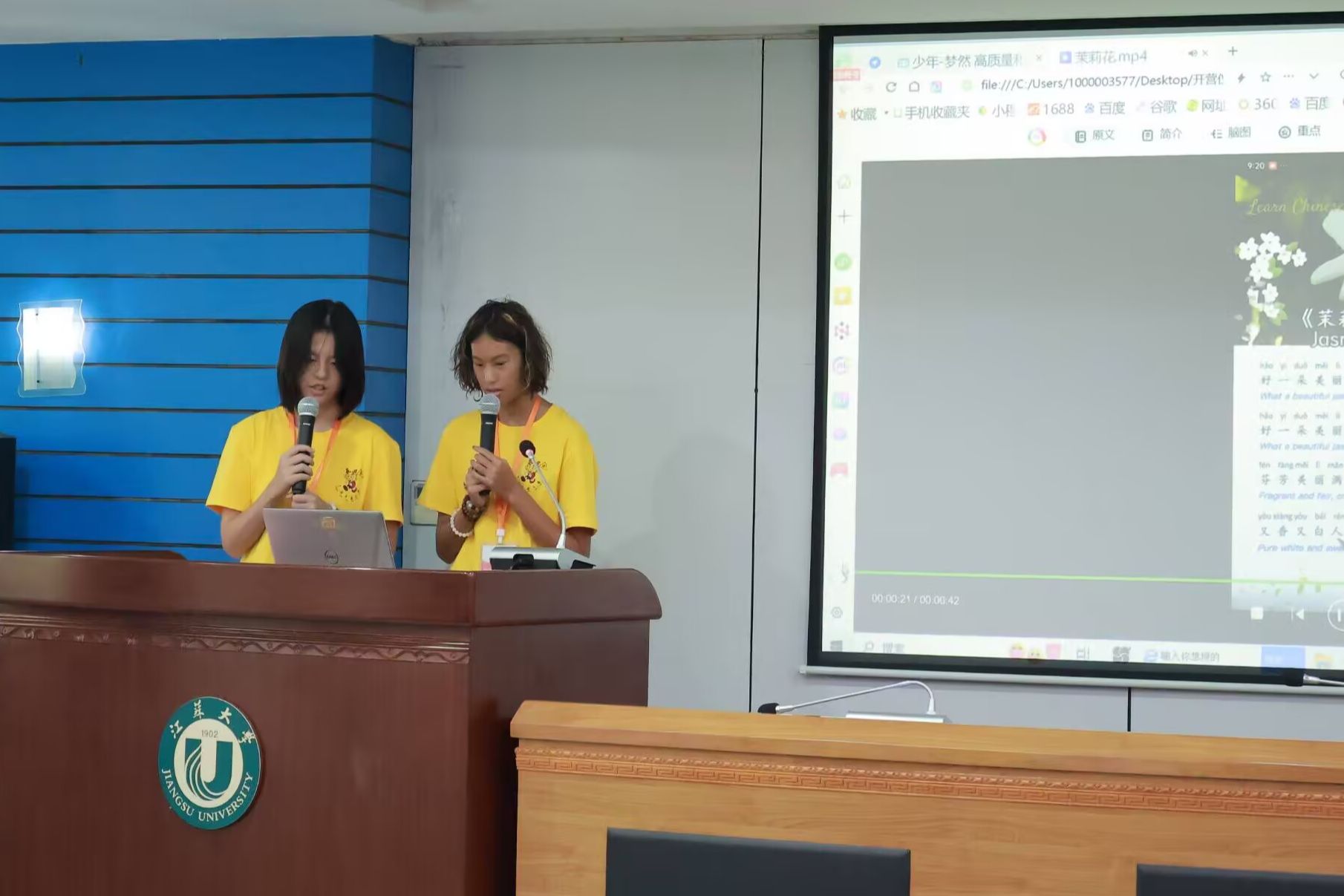开营仪式上,精彩纷呈的文艺表演展现了传统与现代、东方与西方的文化交融。乐鱼官方体育网站教师、非遗古琴传习人吴芸莉带来了古琴独奏《酒狂》,西班牙营员沈馨宜表演了舞蹈,加拿大营员郭伯恩和郭安雅演绎了男女声二重唱《推开世界的门》,何舒窈和李馨怡倾情献唱江苏民歌《茉莉花》,乐鱼官方体育网站志愿者团队以饱含深情的原创朗诵《北固山下的寻根之旅》诠释了文化寻根的情怀。