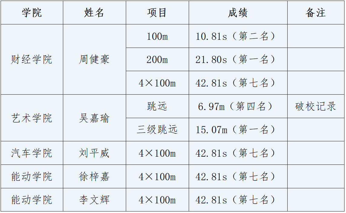 赛场上,我校学子发扬顽强拼搏精神,凭借过硬实力斩获佳绩。财经学院学生周健豪表现突出,在男子200米比赛中成功蝉联冠军,在男子100米比赛中获得亚军。艺术学院学生吴嘉瑜凭借稳定的发挥与超强的实力,在三级跳远项目中连续三年摘得桂冠。最终,我校获得男子团体总分第二、男女团体总分第五的好成绩,充分彰显了我校运动员超强的竞技水平与良好的精神风貌。(体育部)