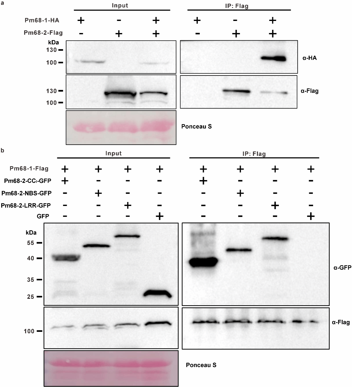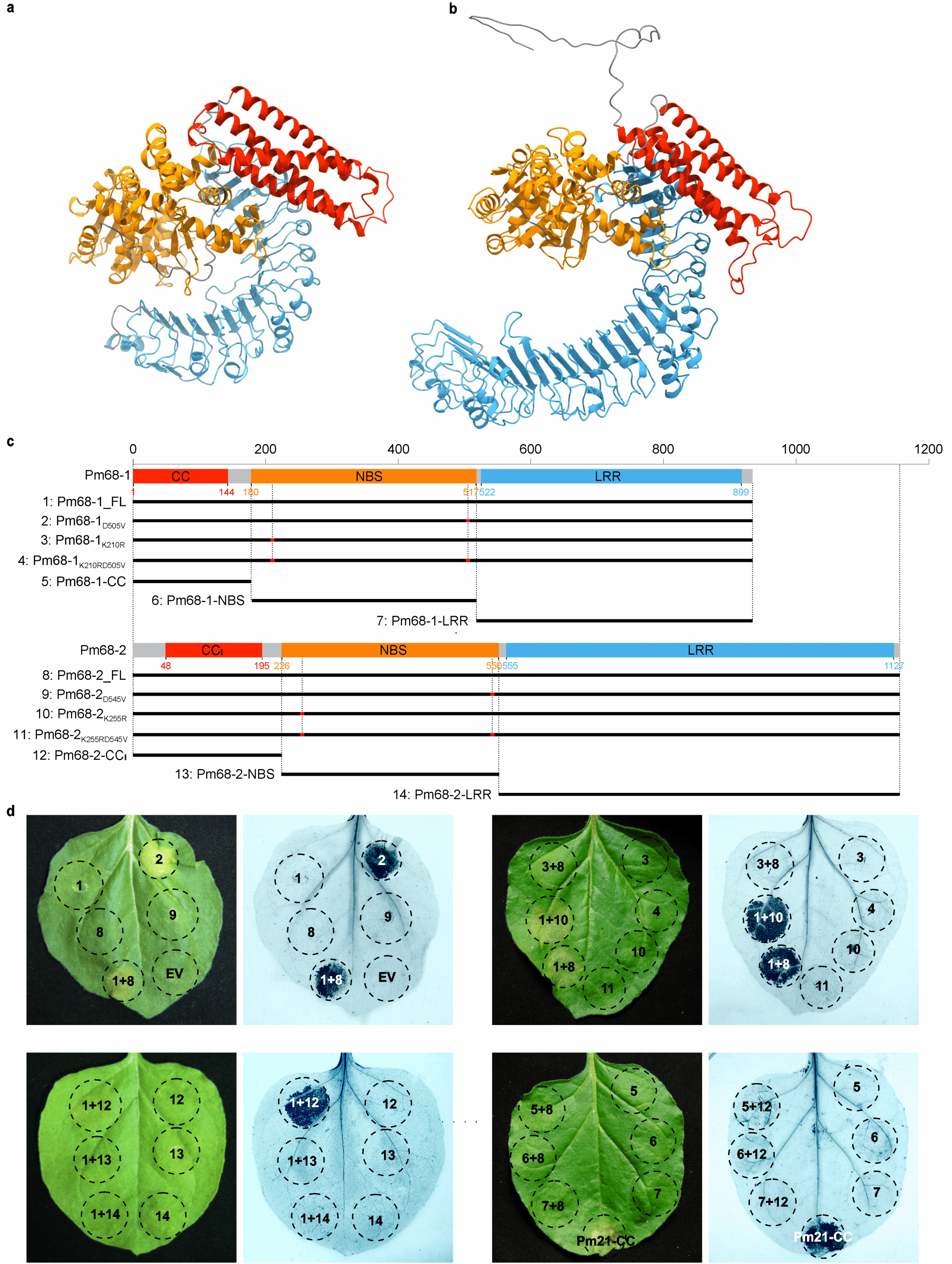 为了确定Pm68-1和Pm68-2之间的功能关系,研究者构建了一系列表达载体,在本氏烟草叶片中进行瞬时过表达实验。结果表明,单独表达Pm68-1和Pm68-2均不能够引起烟草细胞死亡,而共表达Pm68-1和Pm68-2能够诱发细胞死亡。对两个NLR的MHD位点和P-loop位点进行突变分析,结果显示只有Pm68-1与执行细胞死亡有关。进一步分析不同结构域,发现只有全长Pm68-1和Pm68-2的CC1结构域共表达才能诱发烟草细胞死亡。由此推测,Pm68-1是诱导细胞死亡的关键参与者,其活性受到Pm68-2的CC1结构域的调控。Co-IP实验证实Pm68-1与Pm68-2及其三个结构域都能发生互作。