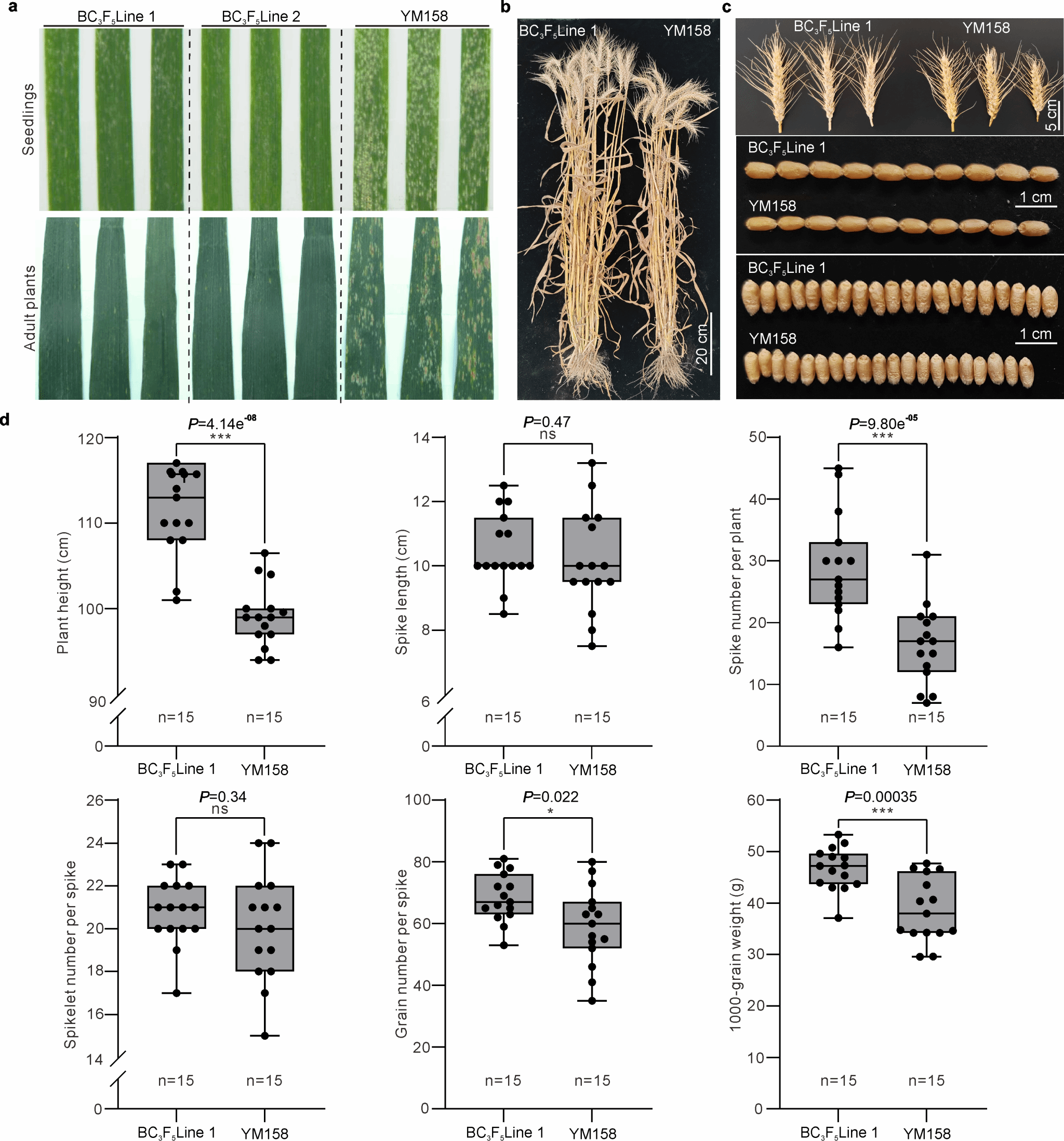 研究者将携带Pm68基因的硬粒小麦TRI 1796与感白粉病的小麦骨干亲本扬麦158杂交,并以扬麦158作为轮回亲本多次回交、自交后,创制了含有Pm68的普通小麦渐渗系,它在苗期和成株期均能表现出良好的白粉病抗性,而且该新种质的单株穗数、穗粒数和千粒重等重要农艺参数均显著高于轮回亲本扬麦158,具有较好的育种利用价值。