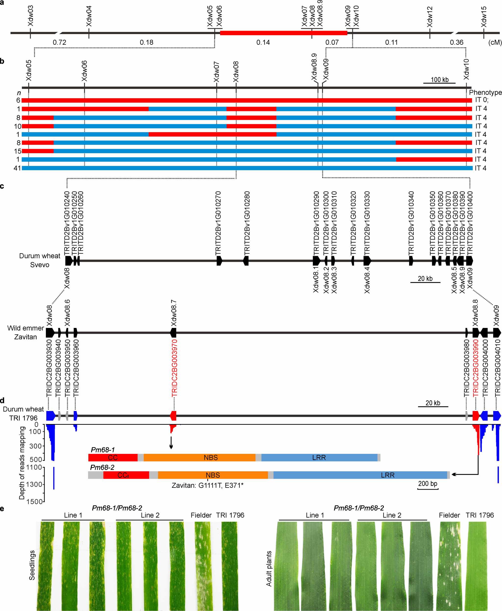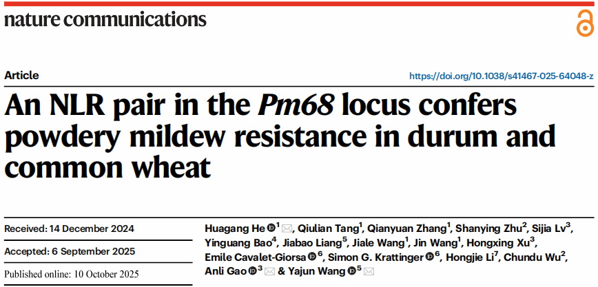 该研究从硬粒小麦中成功克隆了抗白粉病新基因Pm68,证实Pm68抗性是由两个NLR基因联合控制,并揭示了两个NLR蛋白的分子互作机理,同时还创制了携带Pm68的抗白粉病小麦新种质,为其育种利用奠定了良好的基础。