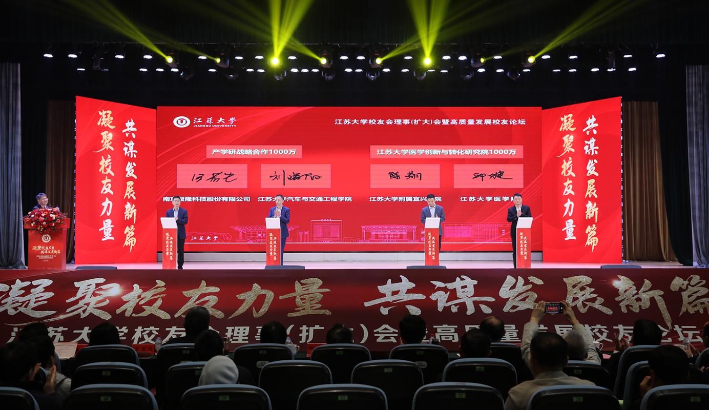 会上,校友企业、南京聚隆科技股份有限公司与学校签订价值1000万元的战略合作协议,深化双方产学研合作;校友单位、乐鱼官方体育网站附属宜兴医院与医学院共建“乐鱼官方体育网站医学创新与转化研究院”,签订1000万元共建协议。电气自动化79级校友、南京聚隆科技股份有限公司董事长刘曙阳,汽车学院院长汪若尘;乐鱼官方体育网站附属宜兴医院副院长陈翔,医学院党委书记邱健共同上台签约。