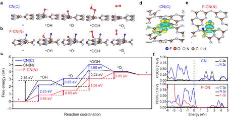 依此,闫研教授课题组通过精细地原位界面表征技术,首次确认了氮化碳光反应过程中碳位点氧化形成的惰性中间体C=O的累积是阻碍水分解反应的瓶颈所在。此外,进一步提出了表面氟化占据碳位点的策略,成功阻止了C=O惰性中间体的形成,使单相氮化碳材料在不借助产氧助催化剂的条件下将纯水分解为氢和氧,解决了困扰科学界已久的氮化碳材料表面分解水反应瓶颈的本质问题。该研究厘清了氮化碳材料界面反应中间体与催化性能间的密切关系,对催化剂的表面状态、水分子构型、和催化反应可行性之间关系的认识得到进一步深入。