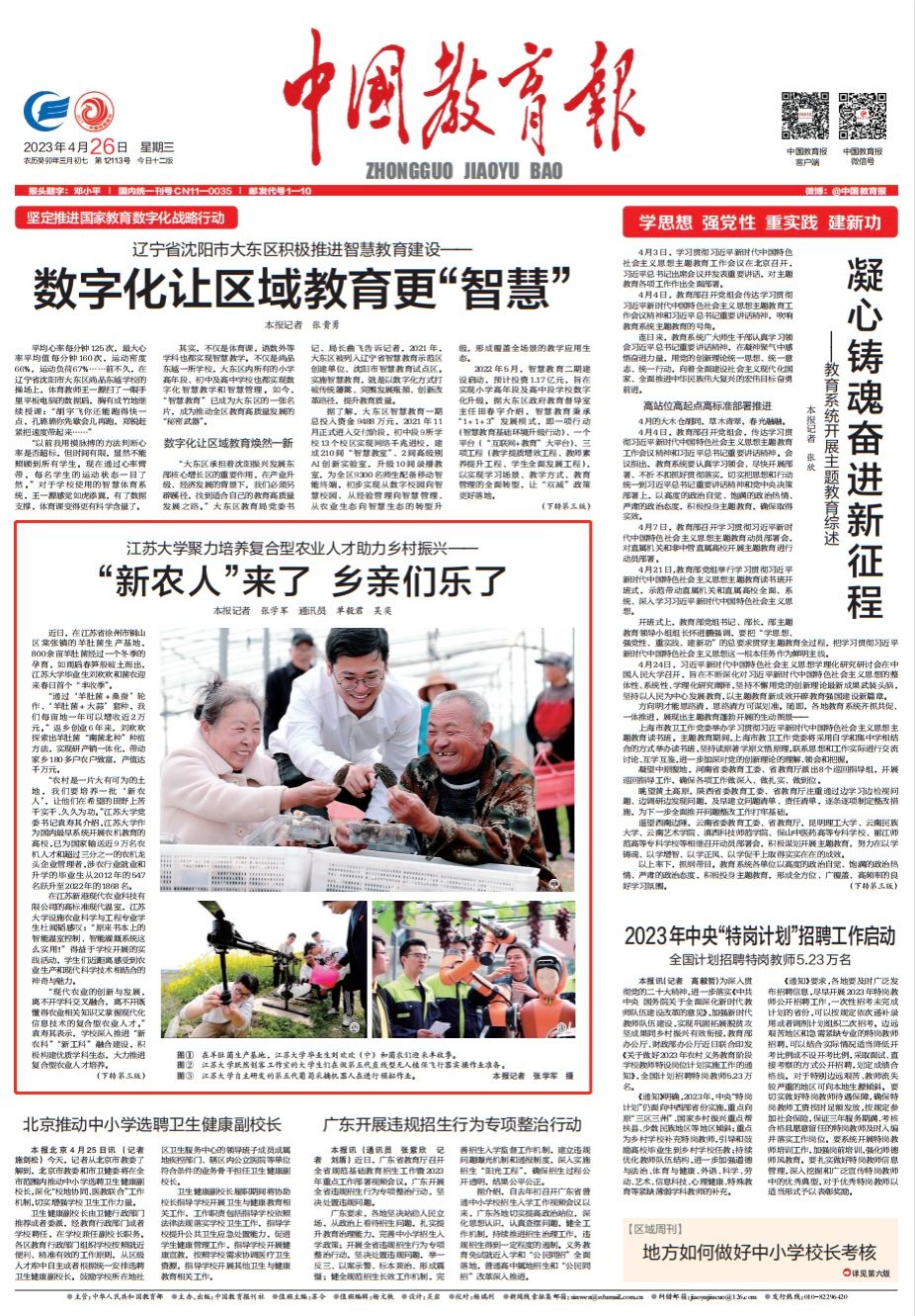 4月26日,《中国教育报》一版刊登文章《乐鱼官方体育网站聚力培养复合型农业人才助力乡村振兴——“新农人”来了 乡亲们乐了》,报道我校培养强农兴农人才,赋能农业现代化的生动实践故事。