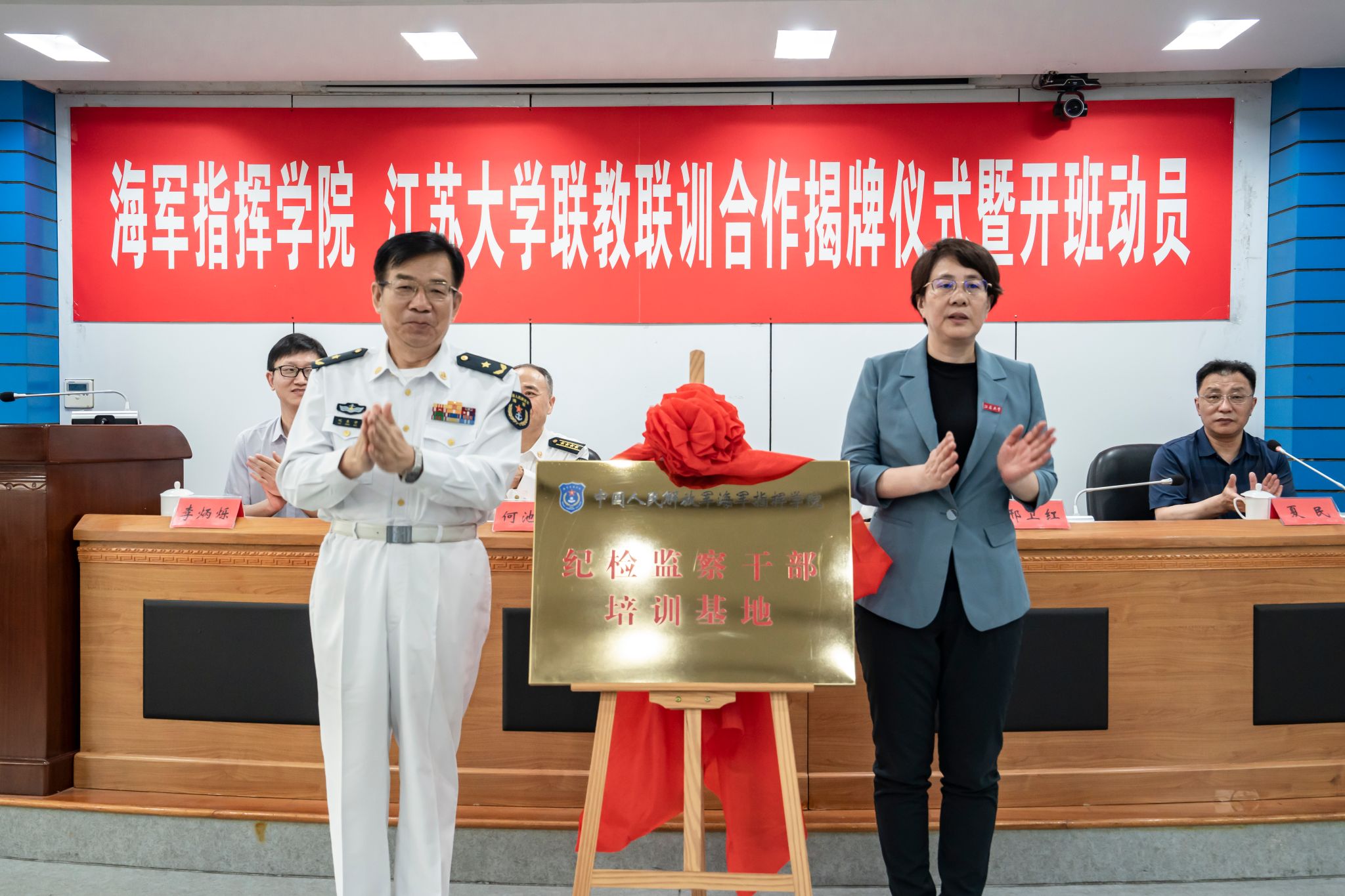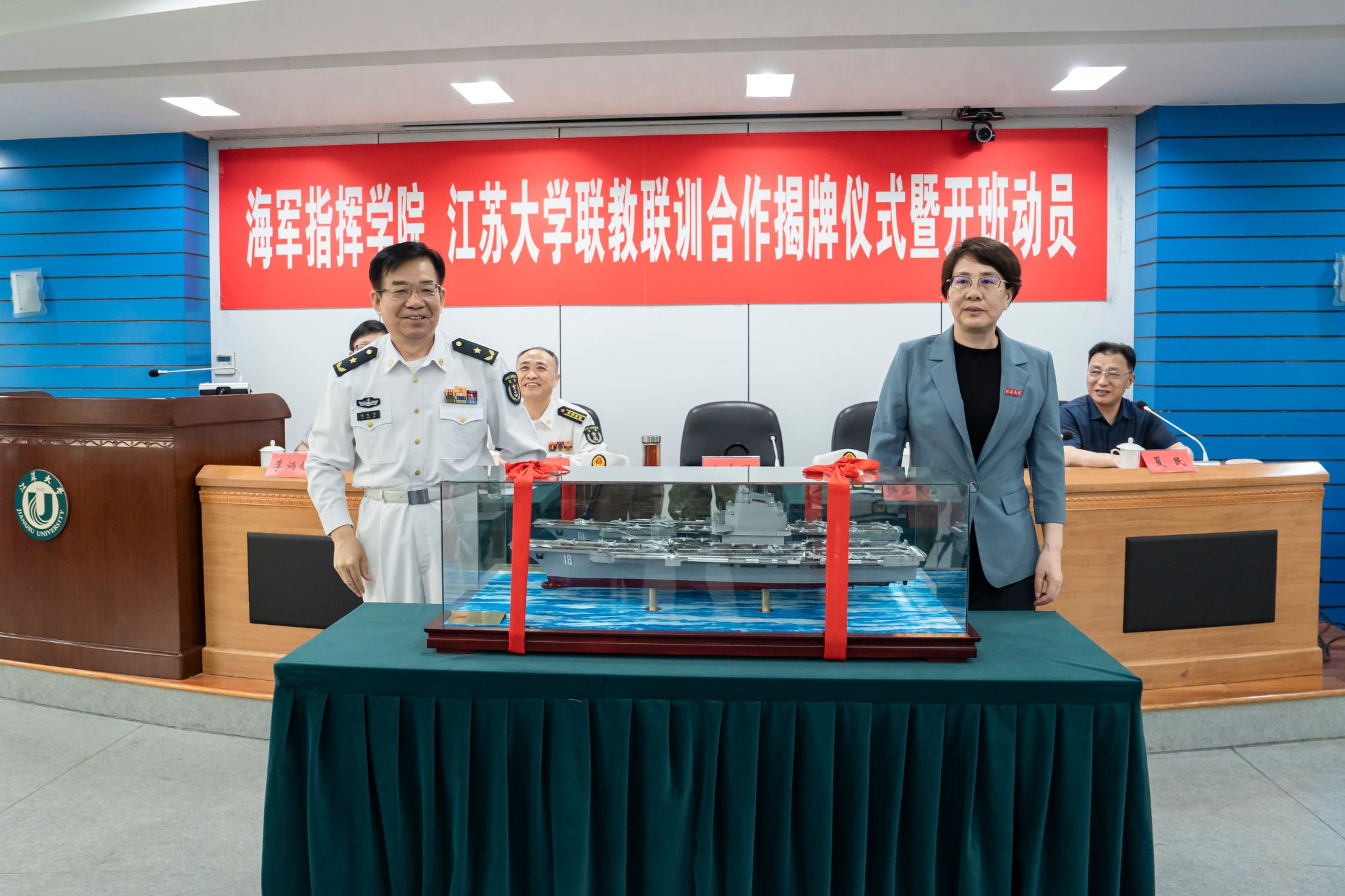 会上,双方签署了军地合作共建协议,为中国人民解放军海军指挥学院纪检监察干部培训基地揭牌。邢卫红代表学校接受叱东学赠予的航母纪念模型。