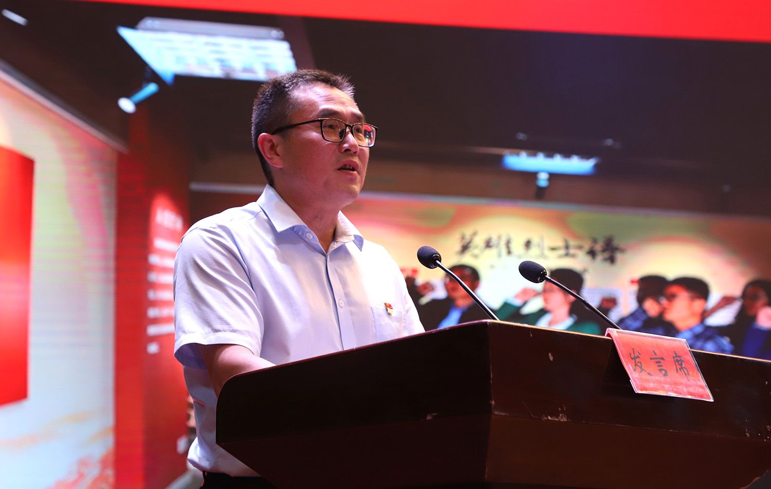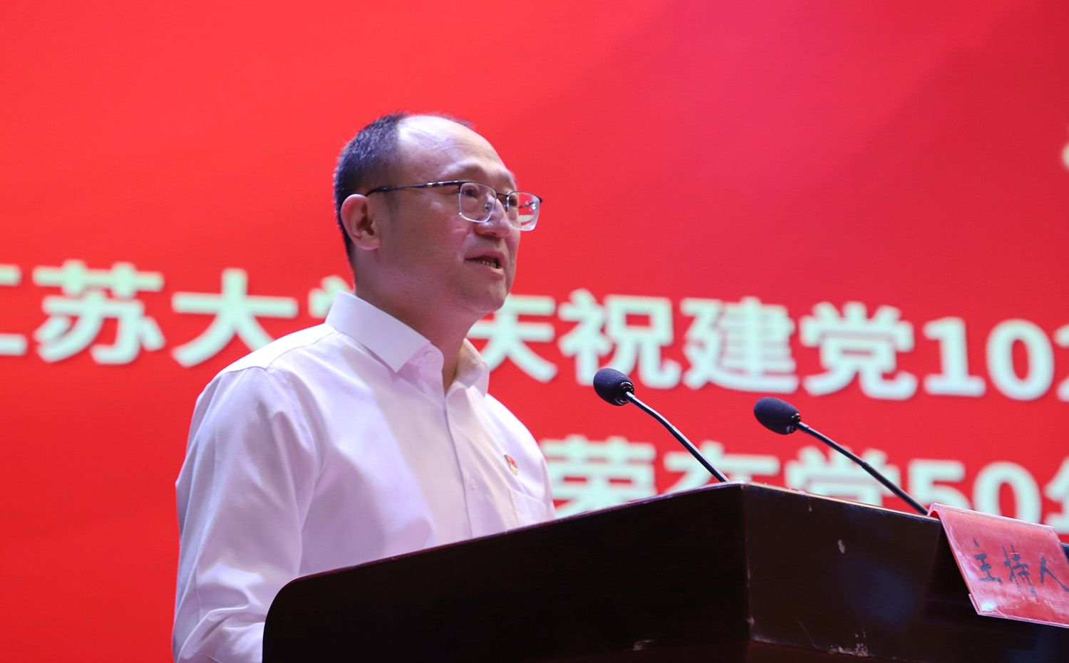 “光荣在党50年”党员代表,我校原医学技术学院调研员王大建同志发言,并带领新党员代表面向党旗宣誓、全体党员代表重温入党誓词。
