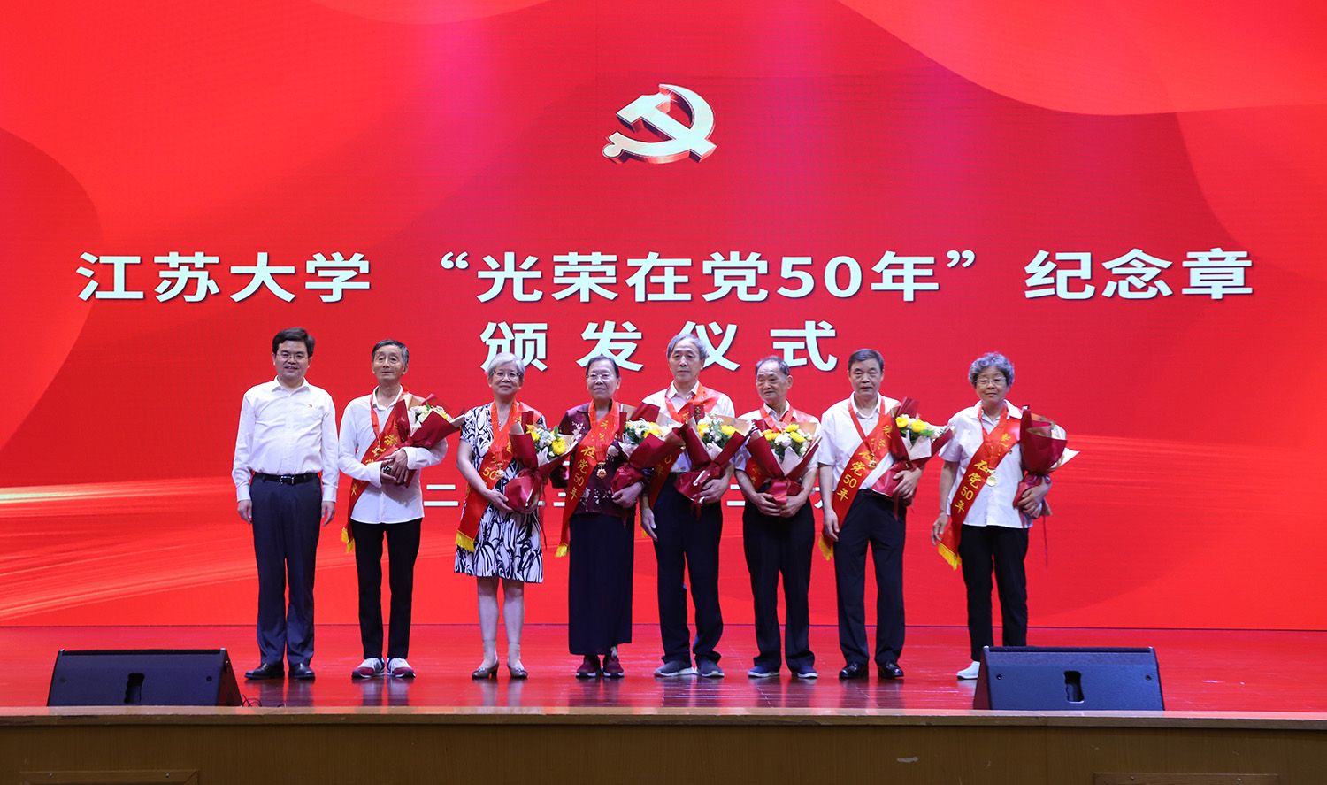 “光荣在党50年”纪念章颁发仪式上,李洪波为到场的7位老党员代表颁发“光荣在党50年”纪念章,7位新党员代表向领受纪念章的老党员代表献花致敬。