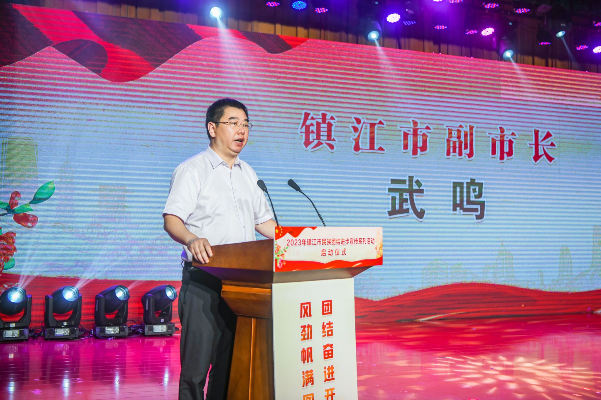镇江市副市长武鸣,副校长张济建出席活动并致辞。校党委常委、统战部部长杨敬江,京江学院主要领导及400余名各族师生参加活动。