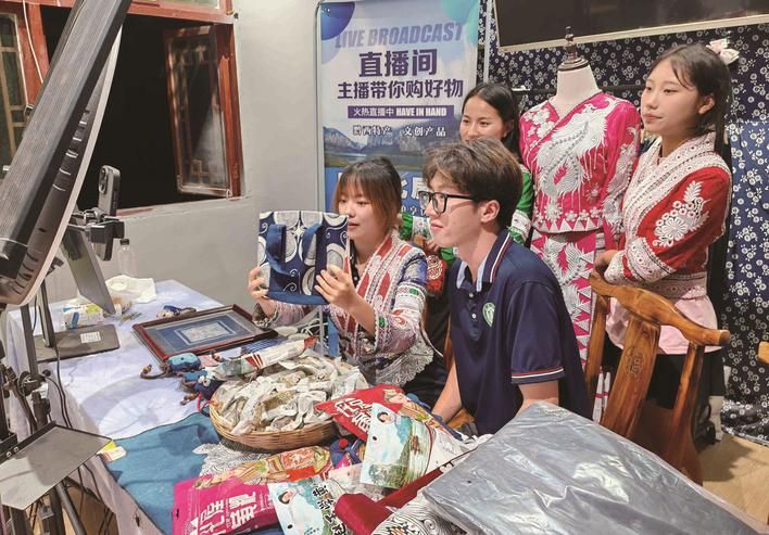 8月17日,乐鱼官方体育网站能动学院“新农人 兴农梦”暑期社会实践团队,走进贵州省黔西市新仁苗族乡化屋村。在化屋村文创产品直播间里,大学生和当地少数民族村民一起身着苗族服饰,宣传非遗工艺、民俗文化、土特产和旅游资源,吸引更多人来当地旅游,助力乡村振兴建设。