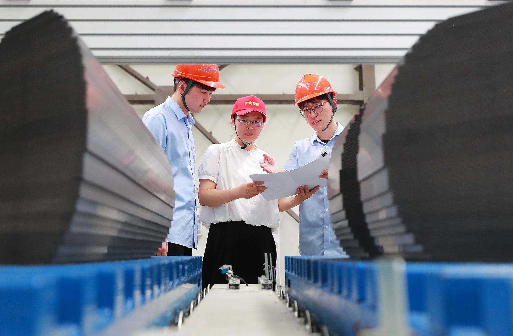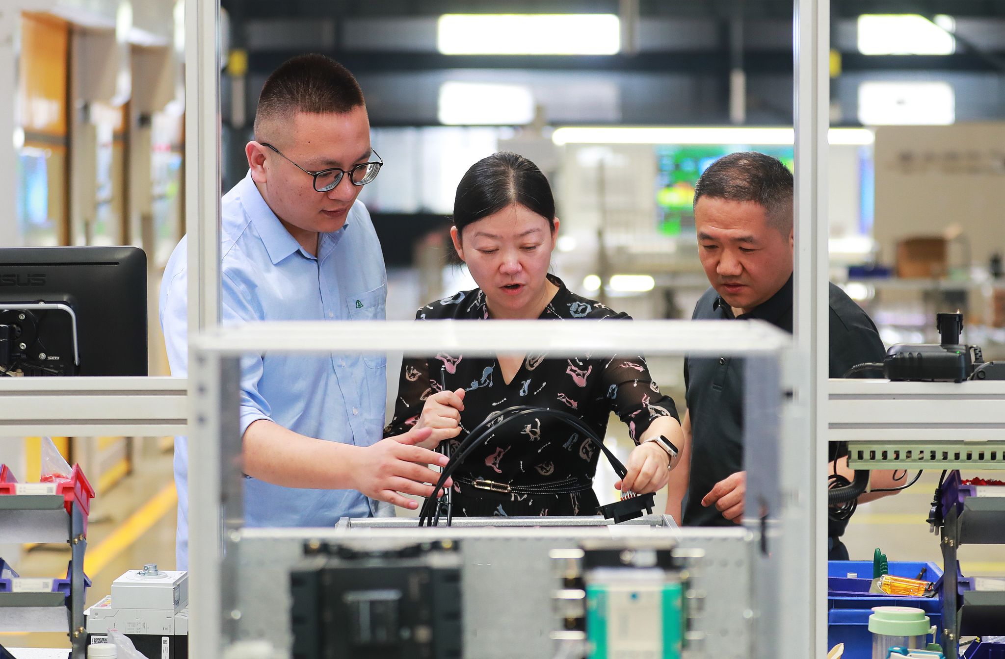 在江苏大全集团低压成套电气生产车间,乐鱼官方体育网站计算机科学与通信工程学院教师宋雪桦(中)、金华(右)与企业技术人员交流基于AI的自动化生产线检测技术。