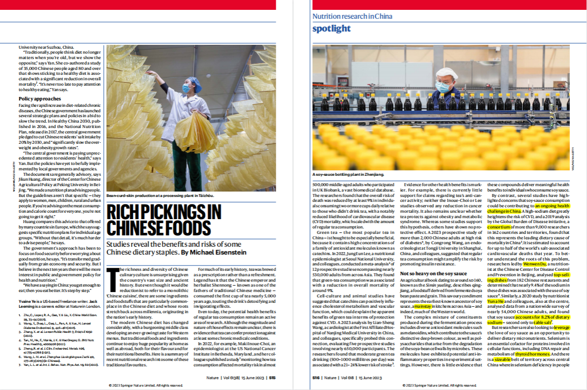 6月15日,在《自然》刊发的文章“RICH PICKINGS IN CHINESE FOODS”中提到,“研究人员也在寻求机会,利用人们对酱油的热爱来提供膳食微量营养素。比如位于镇江的乐鱼官方体育网站食品科学家高献礼等研究人员一直在探索生产富硒酱油的可能性。”硒是参与细胞功能——包括修复DNA和甲状腺激素代谢——的蛋白质的必需辅助因子。此外,在中国中部有大片地区由于土壤中的硒含量较低,人们缺硒问题严重。高献礼及其同事注意到,酱油提供了一种极好的生化介质来传递具有高生物利用度的硒,他们用一种富硒杂交大豆变体开发了一种制剂,可以让每份酱油中硒的含量增至原先的10倍。