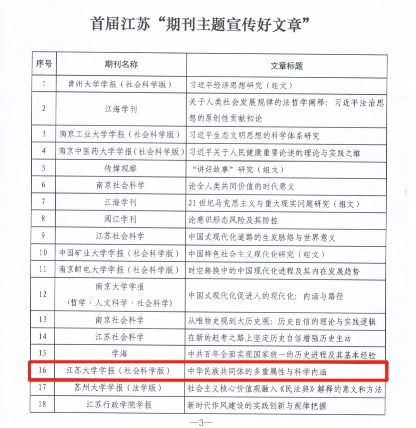 近日,江苏省新闻出版局主办、省期刊协会承办首届江苏“期刊主题宣传好文章”推荐活动,47篇(组)文章入选首届江苏“期刊主题宣传好文章”。其中,《乐鱼官方体育网站学报(社会科学版)》刊发的《中华民族共同体的多重属性与科学内涵》《中国共同富裕发展的时代背景与“提低”路径》,《高校教育管理》刊发的《高等教育治理体系现代化的方向》等三篇文章成功入选。