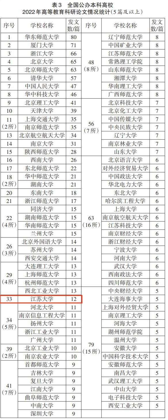 近日,《中国高教研究》发布了《2022年全国高校高等教育科研论文分析——基于19家教育类最具影响力期刊的发文统计》。在全国公办本科高校高等教育科研论文情况统计中,我校以12篇发文进入排行榜,位列全国第33位,比上年度进步5名。
