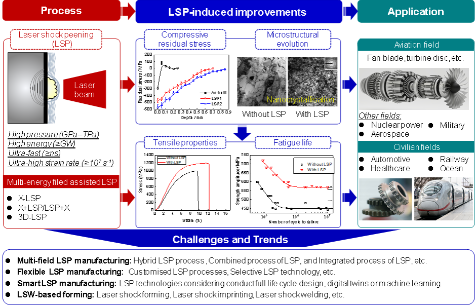 航空制造业被誉为“工业之花”,其制造能力是国家核心竞争力,疲劳破坏是制约航空复杂构件寿命和安全性的重要因素。激光冲击强化(Laser shock peening, LSP)是极端条件下的表面剧烈塑性变形方法之一,具有高压、高能、超快及超高应变率四大显著特点,通过激光诱导的冲击波在金属材料表层产生更深的压缩残余应力场,形成梯度纳米结构,从而材料提升的抗腐蚀和疲劳性能。目前,LSP广泛应用于航空航天、轨道交通、海洋工程、核电等领域。