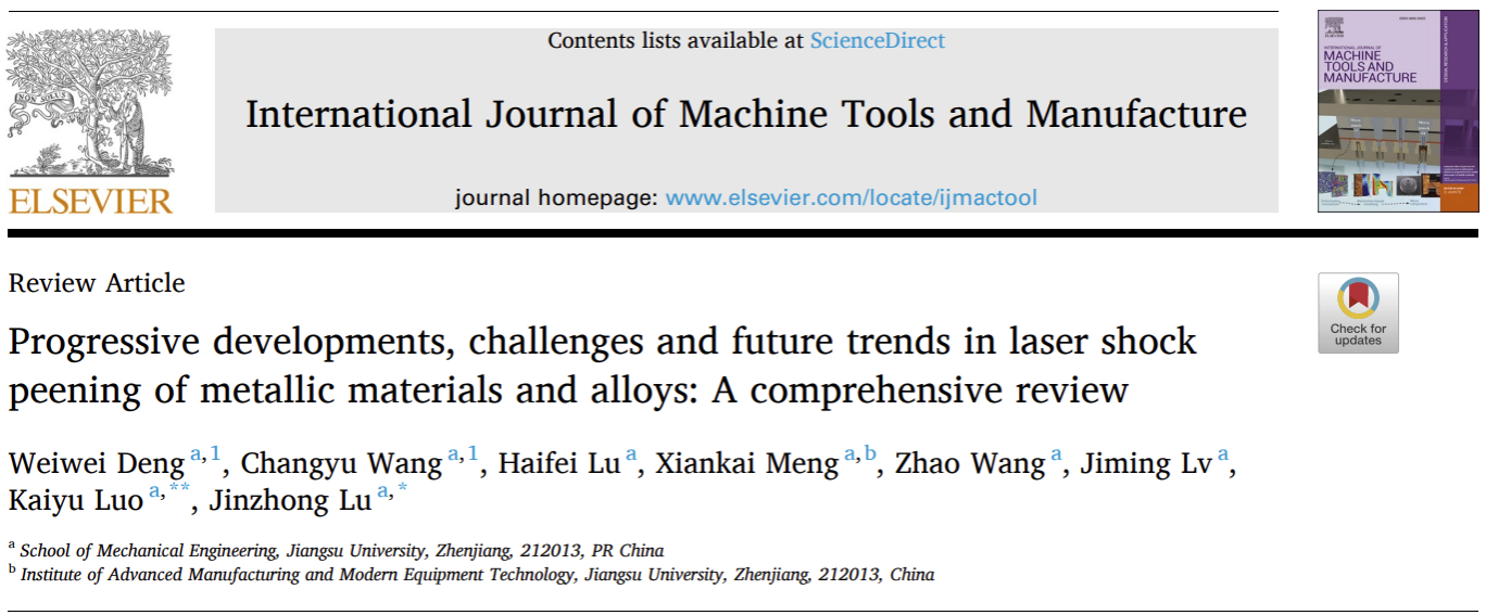 近日,机械制造领域顶刊International Journal of Machine Tools and Manufacture发表了乐鱼官方体育网站机械工程学院鲁金忠教授课题组的长篇综述“Progressive developments, challenges and future trends in laser shock peening of metallic materials and alloys: A comprehensive review”。全文共60页、4万余字、综合大图60幅、349篇参考文献,是目前有关激光冲击强化理论、技术及应用篇幅最长、涵盖内容最广,基于团队近二十年研究工作及相关课题组特色工作综述而成。