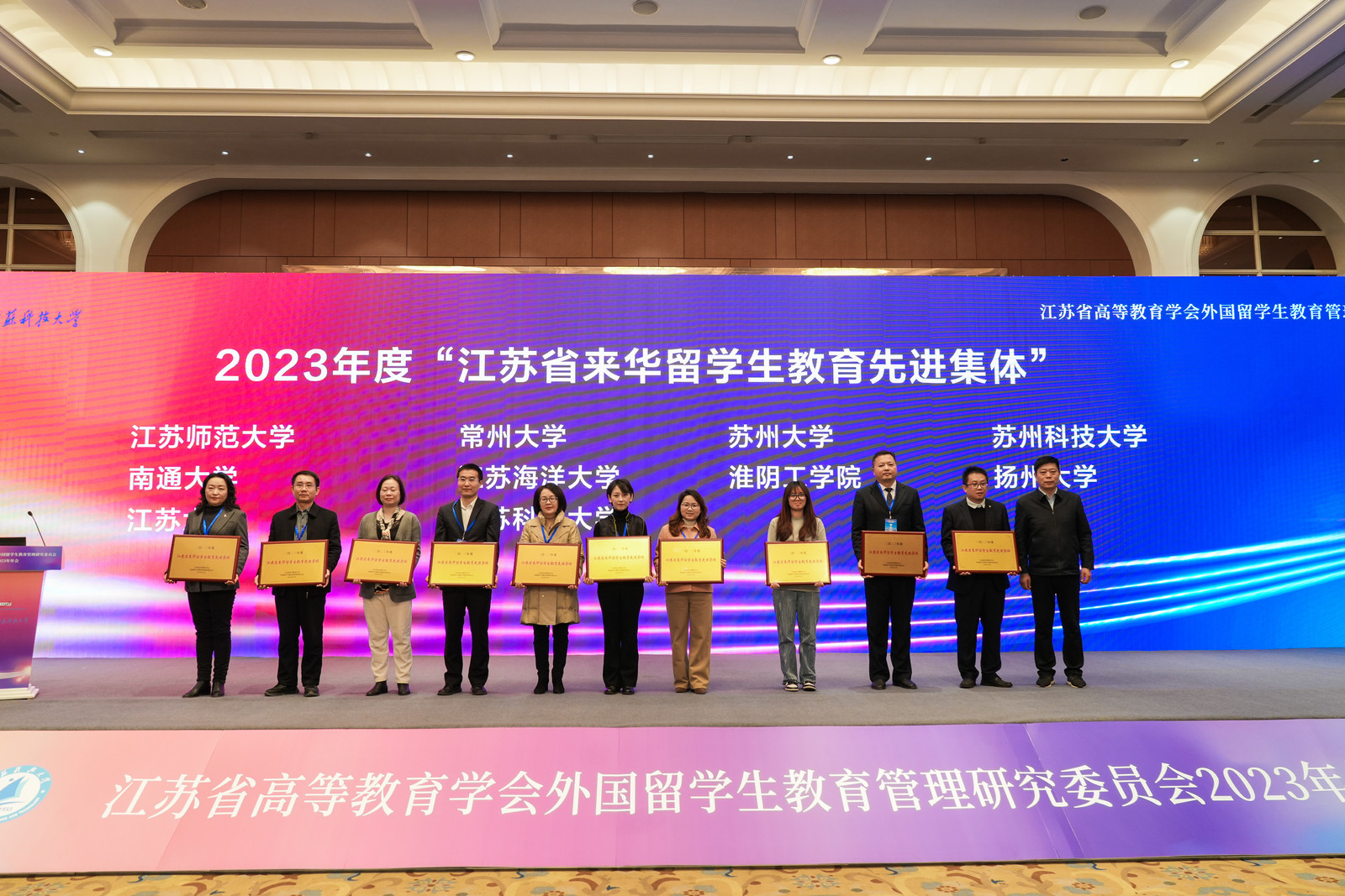 12月29日,江苏省高等教育学会外国留学生教育管理研究委员会2023年年会在镇江召开。我校荣获2023年度“江苏省来华留学生教育先进集体”,海外教育学院教师陈雨杉、陆柳获评2023年度“江苏省外国留学生教育管理先进个人”,于红获评2023年度“江苏省优秀留学生辅导员”荣誉称号。