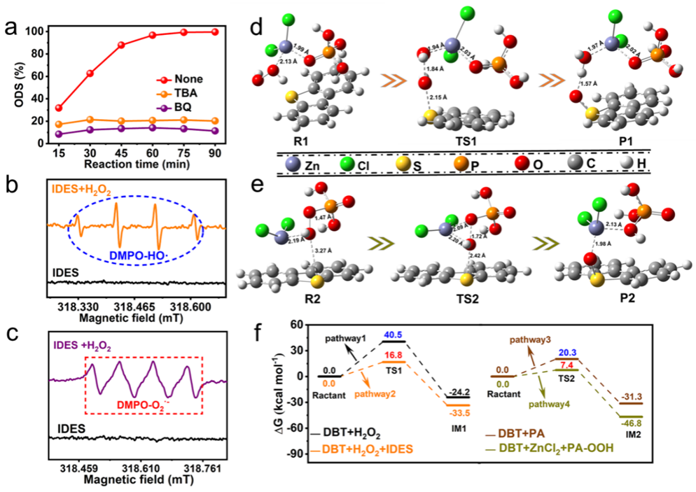 研究表明IDES内的配位作用强化了催化活性位点Zn2+的催化活性,降低了脱硫反应能垒,是高效催化的关键。氧化剂H2O2被复合催化活性中心(Zn···O=P)活化为氧化能力更强的三重反应氧物种(HO•、HO2•和PA-OOH)。凭借IDES本身具备的无机和高效催化优势,在氧化脱硫过程中,IDES对噻吩类硫化物的脱硫效率高达99.9%,且可在不做任何处理的情况下重复使用至少15次,同时有机氧化产物在液-液界面处实现自分离,展现了目前所有报道的DESs氧化脱硫体系中最好的催化性能和稳定性。
