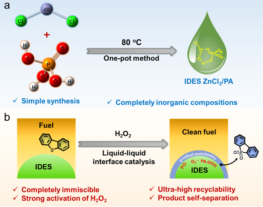 本工作以氯化锌(ZnCl2)和磷酸(PA)为前驱体,通过氢键(Cl···H-O)和配位(Zn···O=P)构建了纯无机低共熔溶剂(IDES-ZnCl2/PA),首次实现了产物自分离的高效液-液界面催化燃油超深度氧化脱硫。