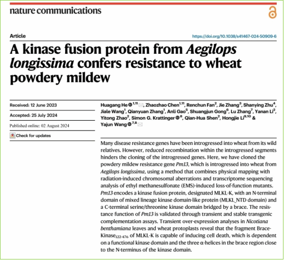 近日,生命科学学院何华纲团队联合多家单位在《自然·通讯》(Nature Communications)上发表题为“A kinase fusion protein from Aegilops longissima confers resistance to wheat powdery mildew”的研究论文,报道了来源于高大山羊草的小麦抗白粉病基因Pm13的克隆,并揭示了其生化功能和进化特性。乐鱼官方体育网站生命科学学院为第一完成单位,何华纲为第一作者兼通讯作者,合作单位中国科学院分子植物科学卓越创新中心王亚军研究员为共同通讯作者,硕士研究生陈昭昭为共同第一作者,硕士研究生王甲乐、张倩渊参加了部分工作。