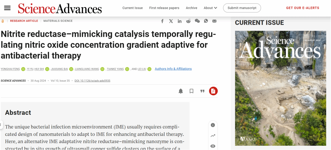 近日,我校材料科学与工程学院新材料研究院刘磊、冯永海团队在Science子刊《科学进展》(Science Advances)上在线发表研究论文“Nitrite reductase–mimicking catalysis temporally regulating nitric oxide concentration gradient adaptive for antibacterial therapy”。乐鱼官方体育网站为第一完成单位,冯永海副研究员为第一作者,刘磊研究员为最后通讯作者,南京医科大学附属常州二院王亮亮博士、中国科学技术大学附属第一医院杨甜柯博士为共同通讯作者。