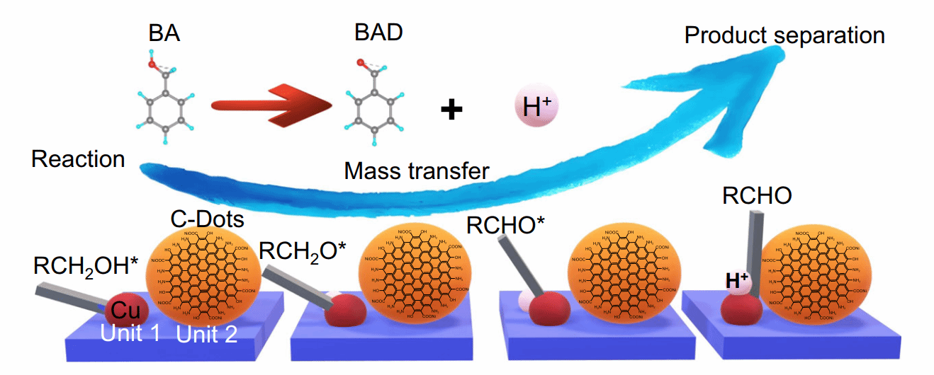 该工作展示了一种有前景的绿色光催化剂设计,使用精细调控的Cu-ZnIn2S4纳米片和碳点作为构建单元,能够在纳米空间中集成反应、传质和分离功能,模拟微型的纳米反应器。根据原位谱学和内建电场计算模拟,由于电荷积累和传质的增强,该功能集成大大促进了苯甲醇氧化耦联析氢反应动力学,氢气/苯甲醛的产生率达到45.95/46.47 mmol g-1 h-1,分别为纯ZnIn2S4的36.87和36.73倍。通过DFT计算表明,苯甲醛高选择性的关键是Cu(II)介导的中间体构象翻转和随后的π-π共轭实现的有效分离。该项工作展示了可用于耦合可持续系统的光催化剂纳米反应器多功能整合设计的概念验证。
